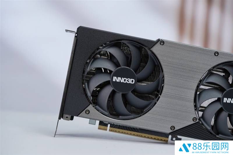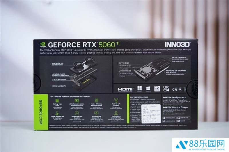 从外观上看,RTX 5060 Ti曜夜16GB显卡设计简约而硬朗,符合SFF-Ready规范,可以轻松放入小机箱。显卡采用双风扇设计,背板为全黑化处理,并有大面积镂空设计以辅助散热。