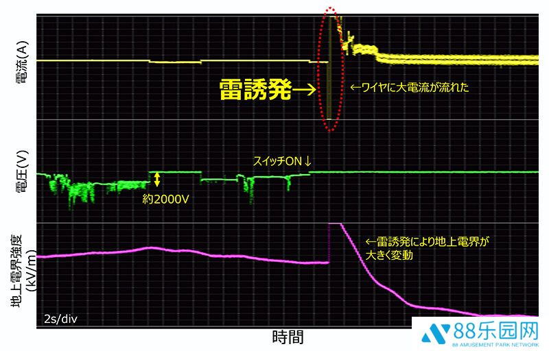 结果证实,大量电流流过导线,同时环境电场强度发生了显著变化(图 3)。此外,该实验还证实就在闪电感应之前,导线和地面之间产生了超过 2000 V 的电压,无人机周围电场强度的突然变化诱发了无人机上的闪电。这是世界上首次利用无人机成功触发闪电的尝试。
