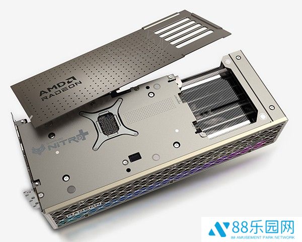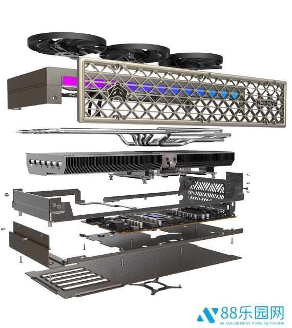 该显卡采用 12 层 PCB,配备高强度冷轧钢框架,散热解决方案为霍尼韦尔 PTM7950 导热介质 + 三分区铜底 + 六热管 + 三风扇,其中风扇采用环叶结构、支持快拆。