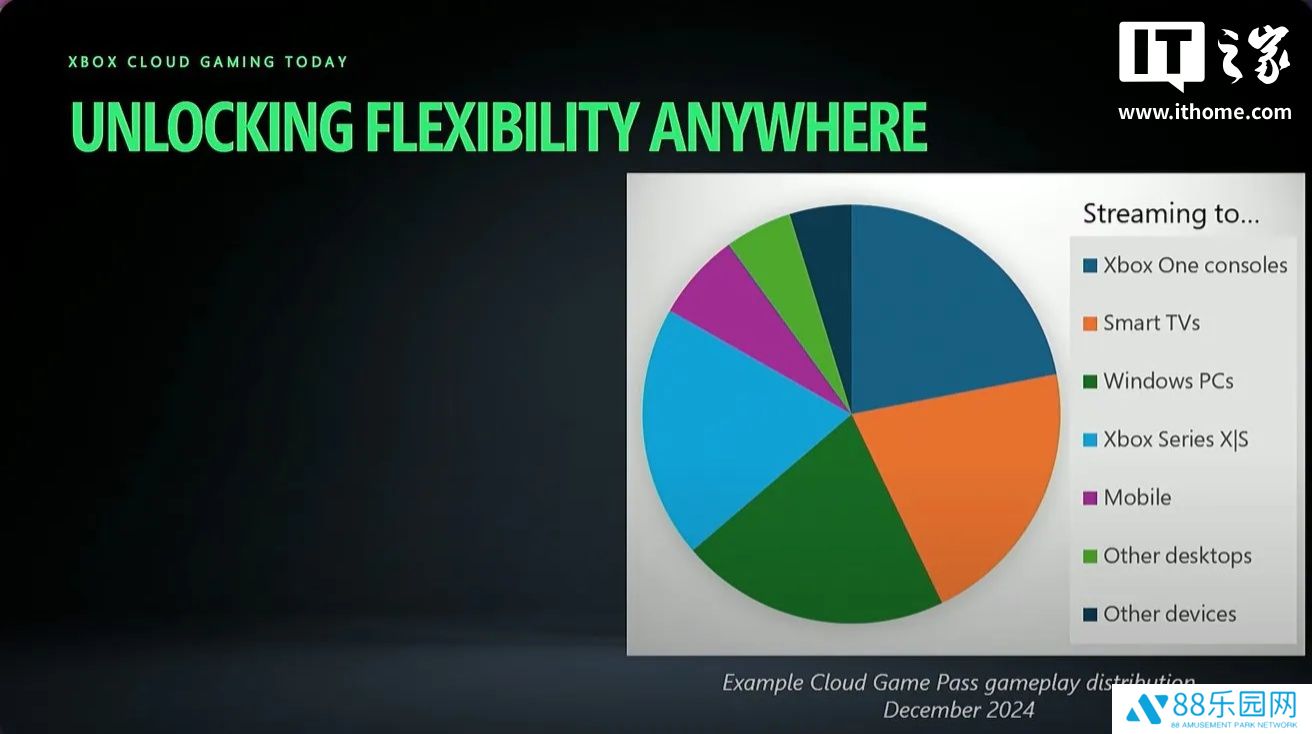 微软最近还在 YouTube 上发布了一场针对 Xbox 云游戏的 GDC(游戏开发者大会)会议内容,展示了 2024 年 12 月期间使用该服务最多的平台分布图。其中,Xbox One 以 21.9% 的使用率位居榜首,智能电视(21.1%)和 PC(20.8%)紧随其后,Xbox Series X|S 的使用率为 19.4%,移动设备为 6.7%,其他设备占比较小。