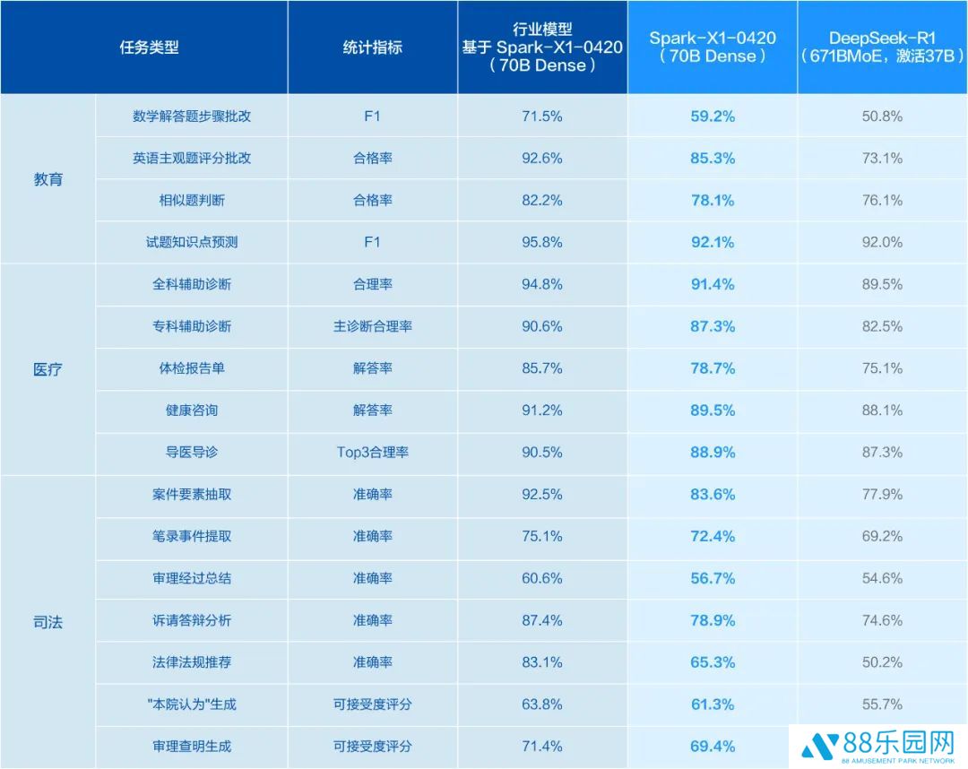 星火 X1 除了在常见通用任务取得显著进步之外,由于融入了更多场景复杂类型数据,模型的泛化性也取得了进步,多个行业任务上展现出了业界领先的能力,在重点行业如教育、医疗、司法等进一步扩大了领先优势。