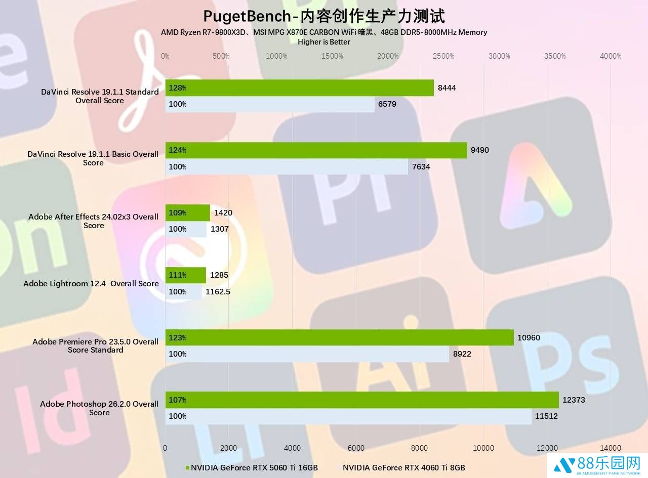 除了游戏性能,微星GeForce RTX 5060 Ti INSPIRE 2X 硬派师16GB在创作领域也表现出色。其配备的16GB GDDR7显存和强大的计算能力能够满足AI创意工作者和内容创作者的需求。在Adobe和达芬奇的Benchmark测试中,该显卡相比RTX 4060 Ti有23-28%的提升,特别是在视频剪辑方面表现尤为突出。