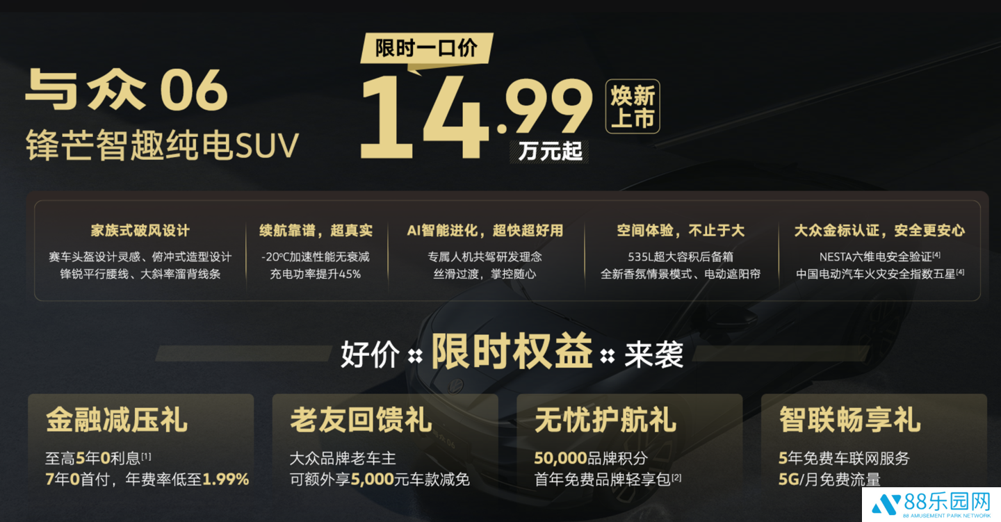 本站 4 月 21 日消息,大众安徽旗下的全新车型“与众 06”正式上市,新车共推出 Pure、Pro、Ultra 以及 Max 四款配置车型,指导价格区间为 18.99 万至 24.99 万元,限时一口价则为 14.99 万至 20.99 万元。作为 ID. 与众的 2025 款车型,“与众 06”对配置进行了升级,并新增了入门版 Pure 车型。