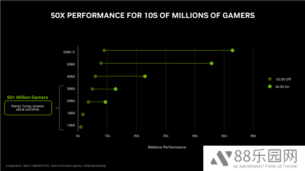 从RTX 5060 Ti的官方性能数据来看,其在性能和延迟方面均表现出色。而与历代x60系列显卡相比,RTX 5060 Ti的性能提升主要得益于DLSS技术的加持。这一技术的引入,不仅提升了显卡的性能表现,更为玩家带来了更为流畅的游戏体验。
