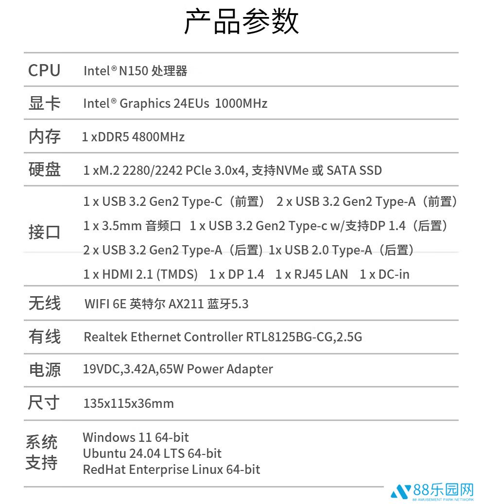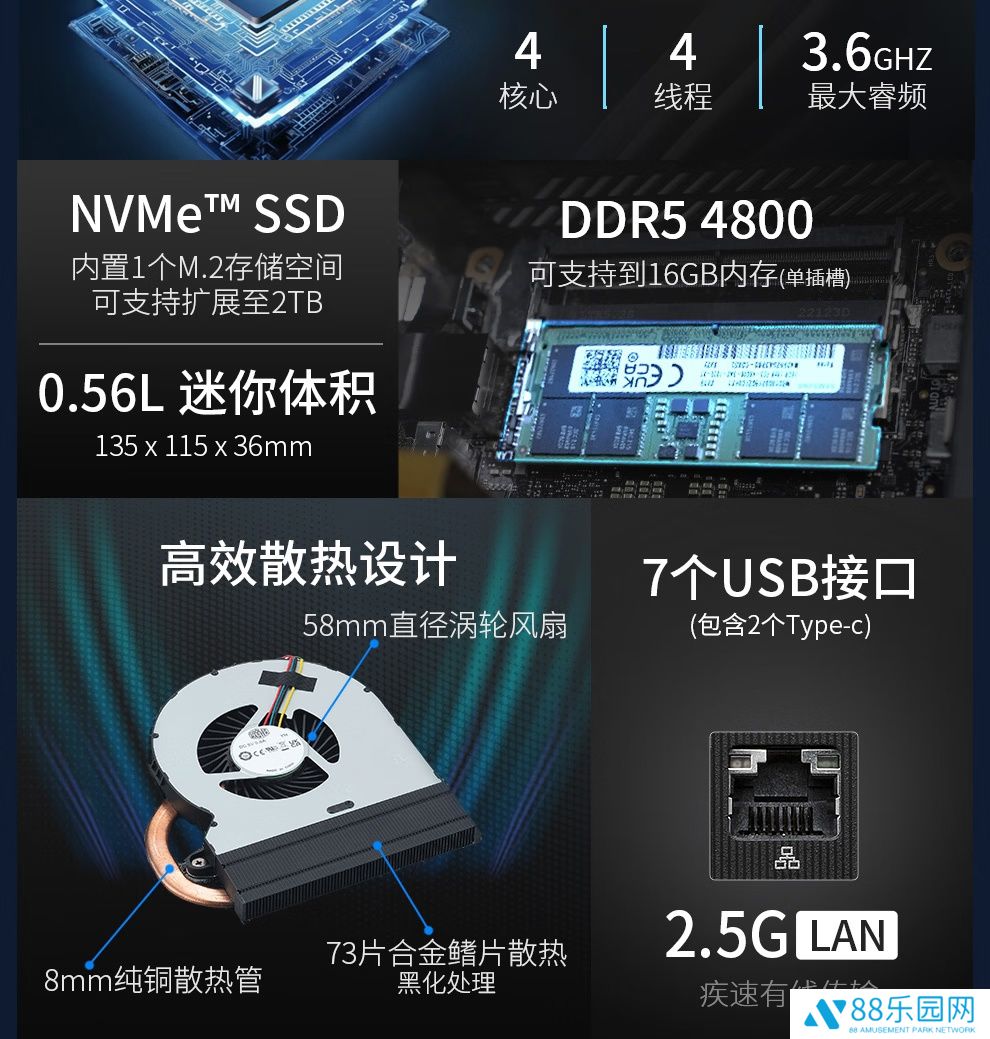 这款小主机提供了一条 DDR5-4800 SODIMM 内存插槽、1 个 M.2 盘位(PCIe 3.0×4 或 SATA),搭载 2.5GbE 有线网卡(瑞昱 RTL8125BG-CG)和支持 Wi-Fi 6E 与蓝牙 5.3 的英特尔 AX211 无线网卡。