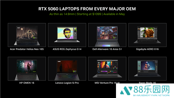 NVIDIA还透露,搭载RTX 5060 Laptop的笔记本将从5月起陆续上市,起售价为1099元。首批合作品牌及产品包括宏碁掠夺者擎16S、华硕ROG幻14 Air、戴尔Alienware 16 Area-51、技嘉AERO X16、惠普暗影精灵16、联想拯救者Y9000P、微星Venture Pro 16 AI以及雷蛇灵刃16,这些产品将为消费者提供多样化的选择。