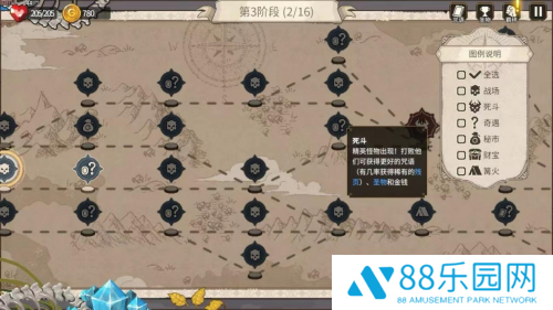 游戏关卡为爬塔闯关,在一张2D横版地图上选择前进的路径,分布着战场、死斗、奇遇、秘市、财宝、篝火不同房间。普通怪的战场、精英怪的死斗,战斗胜利获得新的咒语和金钱。金钱可以在迷市购买圣物、咒语。玩家在篝火处,可以选择回血、升级、删除或者改写咒语。奇遇则会出现随机事件。