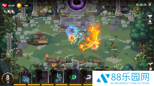 与回合制/横版战斗的卡牌游戏不同,《咒语回声》有了即时战斗后,需要注意敌人出现的位置,合理使用咒语,使用铁皮战士等咒语吸引敌人的攻击,召唤冰火等咒语进行持续输出,再使用范围咒语,增伤残页等进行爆发伤害。