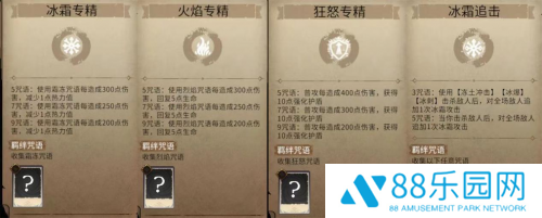 游戏中咒语有着不同的羁绊,收集同一羁绊咒语可以触发羁绊效果,数量越多效果越强。例如,烈焰咒语回血的火焰专精、霜冻咒语降低热力值的冰霜专精、普攻加盾的狂怒专精、增强召唤物的随从专精。