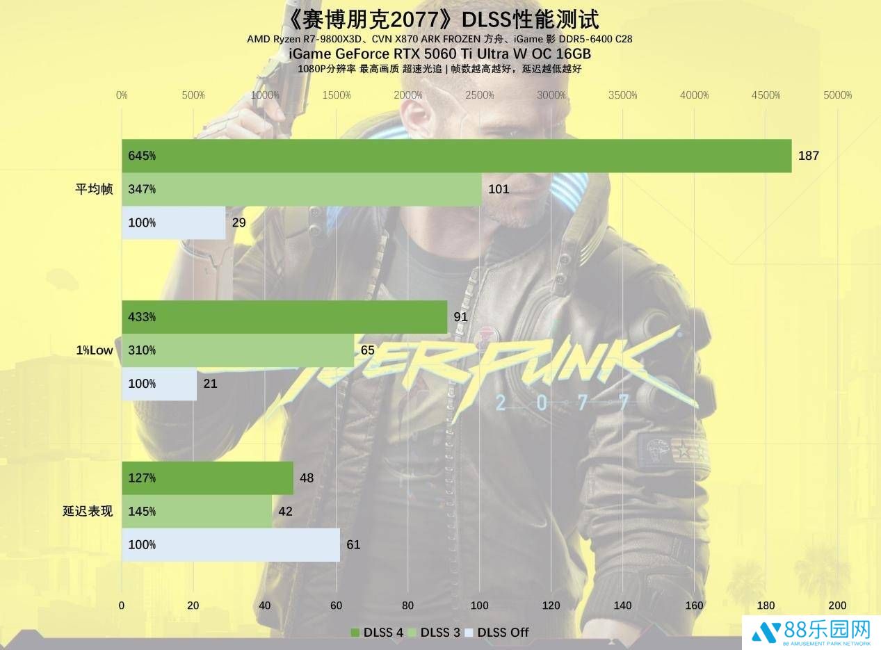 特别RTX 50系列显卡引入了全新的DLSS 4技术,通过多帧生成技术,最多可实现8倍的性能提升。在实际游戏测试中,开启DLSS 4后的iGame RTX 5060 Ti Ultra W OC 16GB在多款游戏中均实现了帧数的显著提升,例如在《赛博朋克2077》中,帧率提升了高达6.3倍。