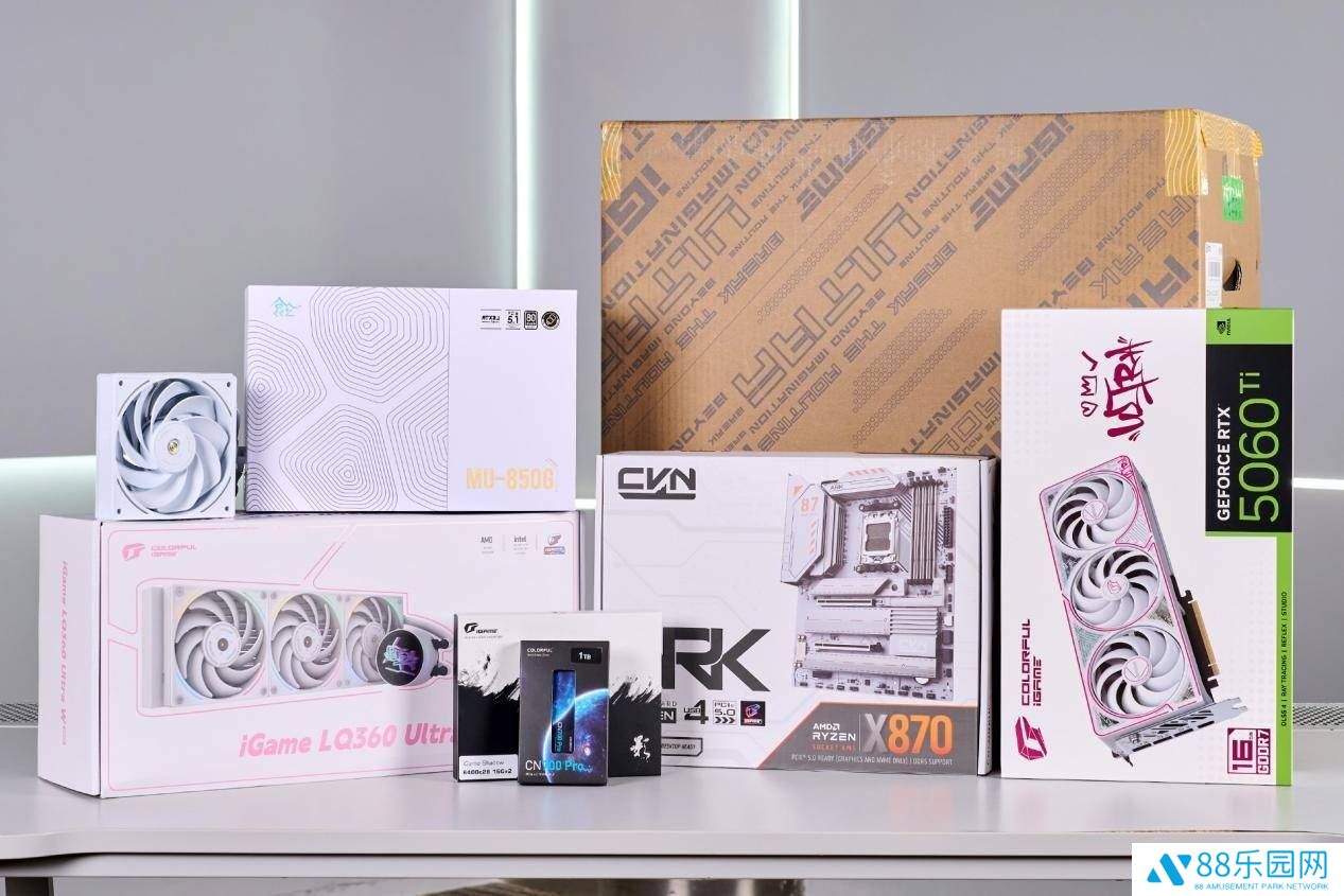 在装机展示中,我们使用了七彩虹全家桶产品,包括iGame GeForce RTX 5060 Ti Ultra W OC 16GB显卡、iGame C25A Ultra W机箱、iGame LQ360 Ultra W 2025一体式水冷散热器等。整套设备采用纯白外观设计,构建了一台以白色为主题的电竞主机。主机前脸独特的iGame RGB深渊镜设计,通电后营造出深邃且绚丽的视觉效果,与机箱内部自带的Ultra图腾灯板相互呼应。