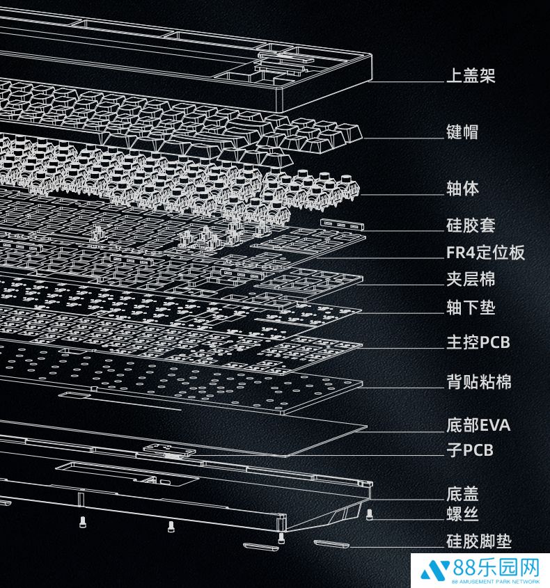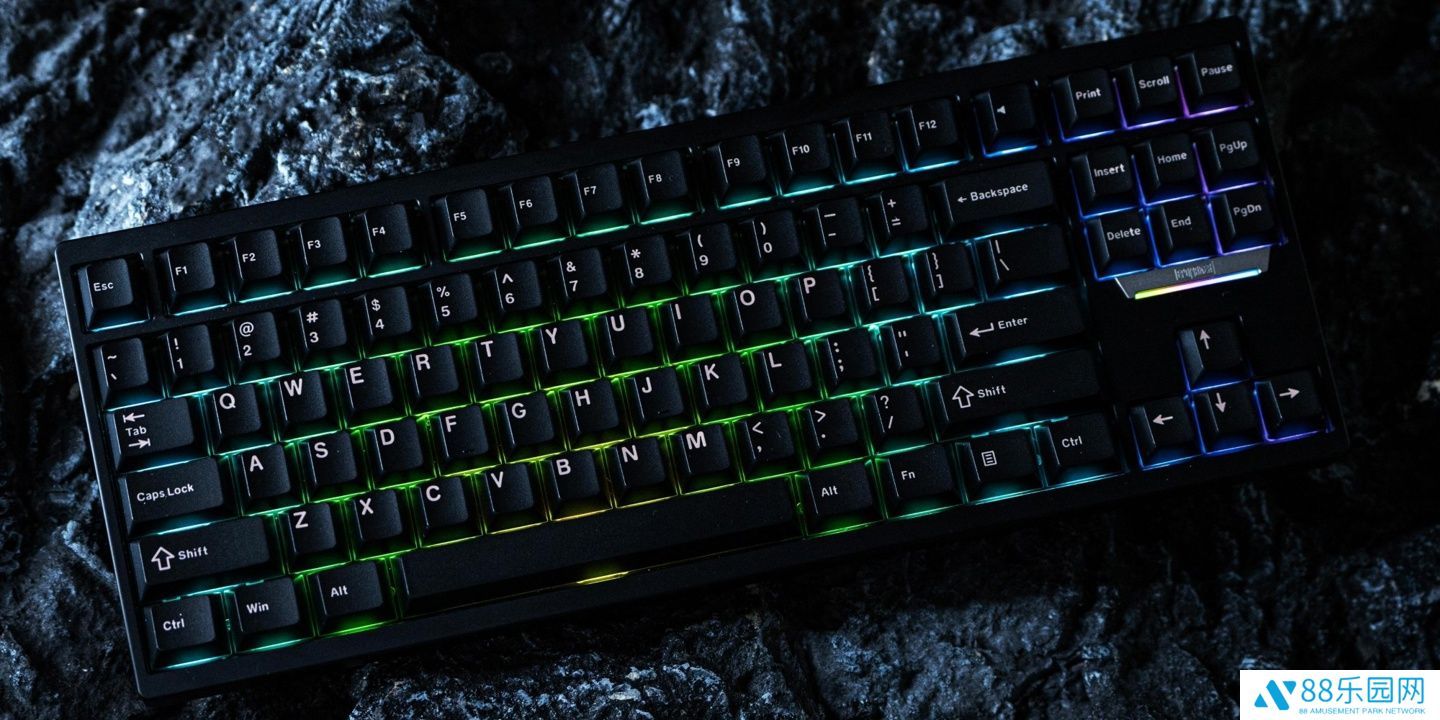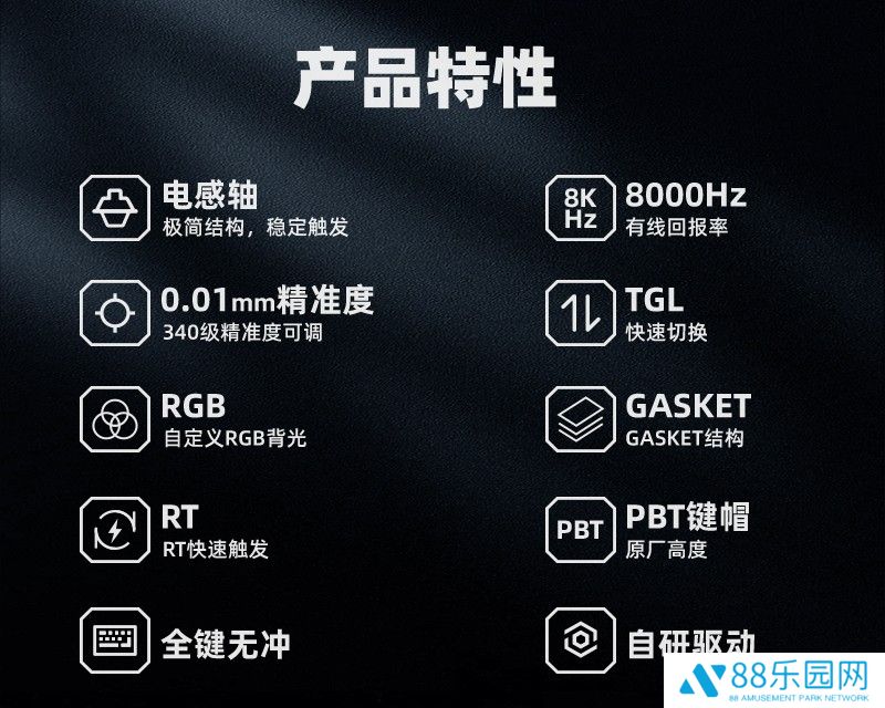 该键盘采用黑色阳极氧化 CNC 全铝外壳,内部为 Gasket 垫片固定结构,具备 FR4 定位板和多层填充结构。此外其搭载原厂高度 PBT 材质键帽和下灯位 RGB 背光,支持 8KHz 回报率和 0.125ms 低延迟。