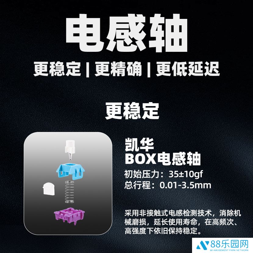 EpomakerMagcore 87 搭载基于非接触式电感检测技术的凯华 BOX 电感轴,轴体初始压力 35±10gf,总行程 0.01~3.5mm,支持 0.01ms 精度 340 级触发行程调整,具备快速重置、快速触发、DKS 等一系列功能。