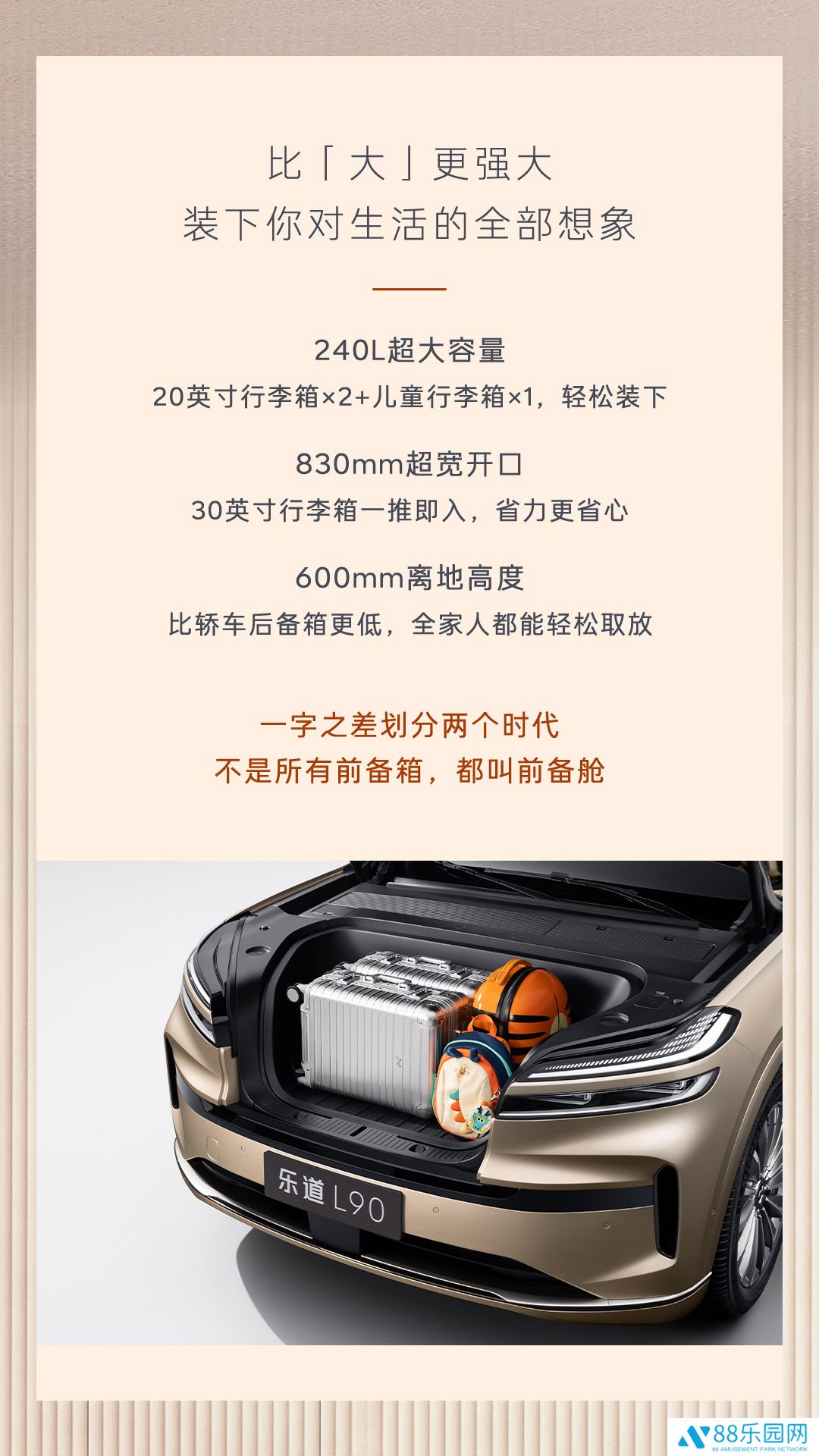 据介绍,新车搭载的前备“舱”能放下两个 20 英寸行李箱 + 一个儿童行李箱,或是 30 英寸的行李箱。其具备 830mm 开口、600mm 离地高度,比轿车后备箱“更低”。