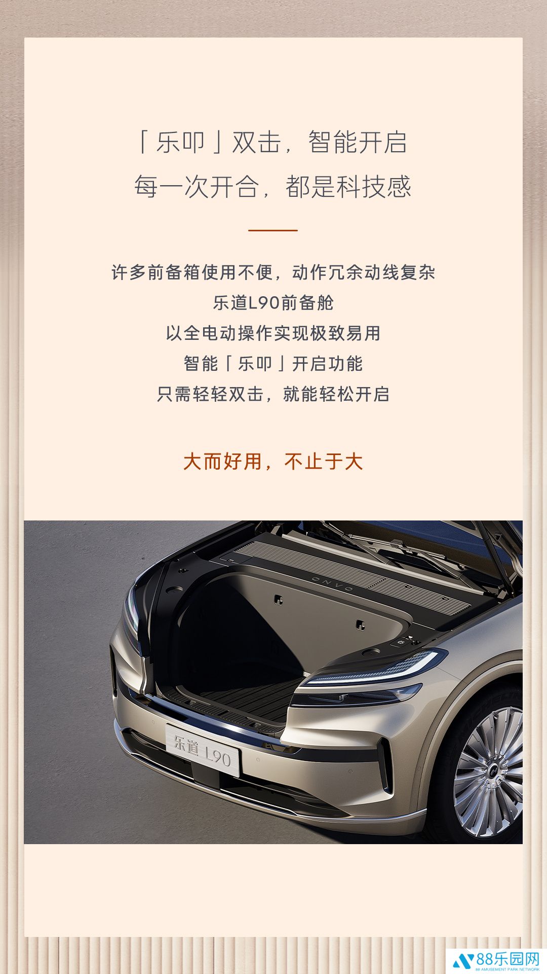 本站 4 月 21 日消息,乐道汽车今日继续预热旗下中大型 SUV 新车 —— 乐道 L90,其搭载容积为 240L 的智能电动前备舱,官方更放言:不是所有前备箱都叫前备舱。