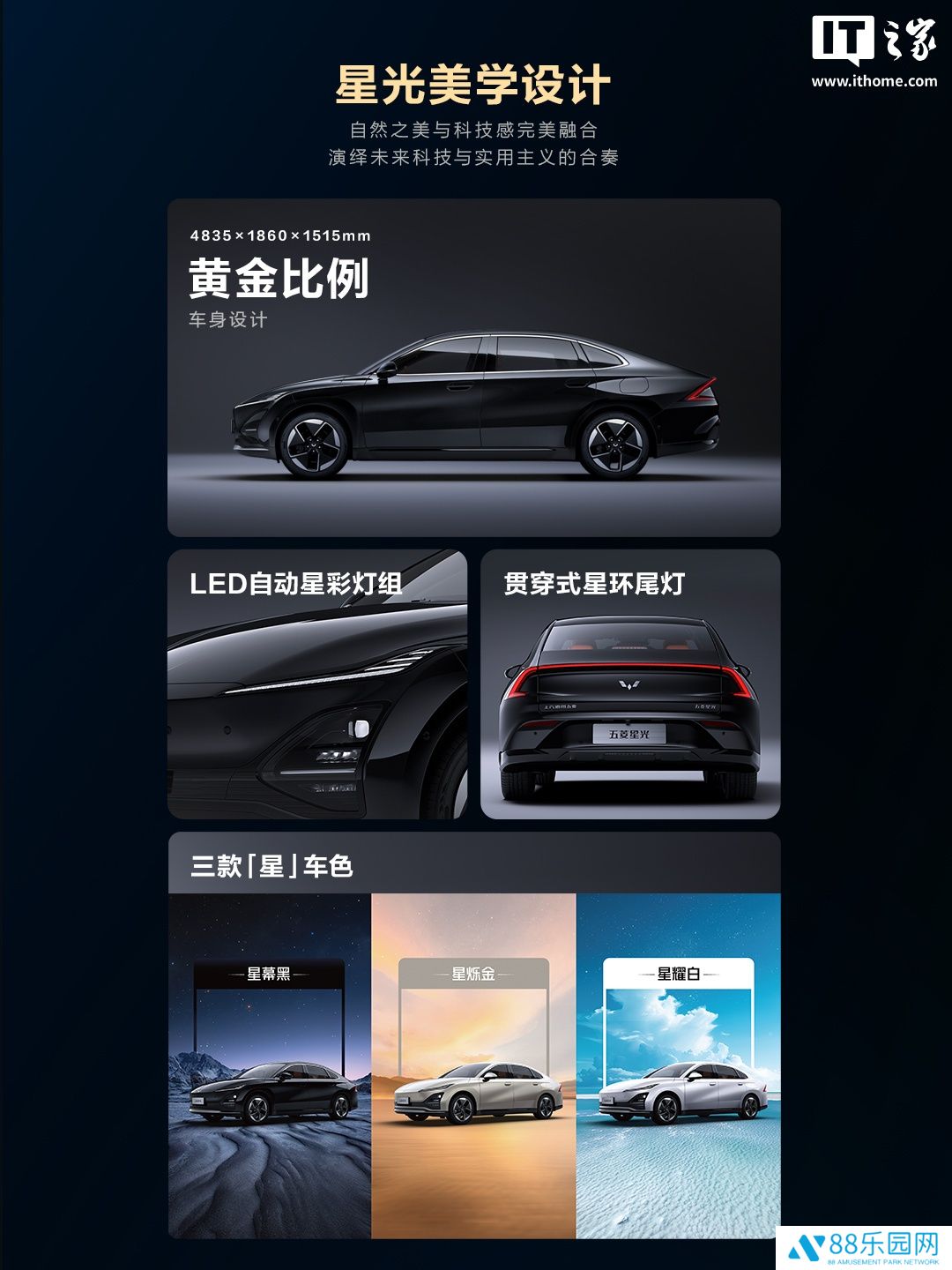 该车尺寸为 4835x1860x1515mm,轴距达 2800mm,与 2024 款相同;搭载 LED 自动星彩灯组,配有贯穿式星环尾灯,还有 18 寸精车星旋轮毂以及半隐藏式门把手,可选三种车身外观配色。