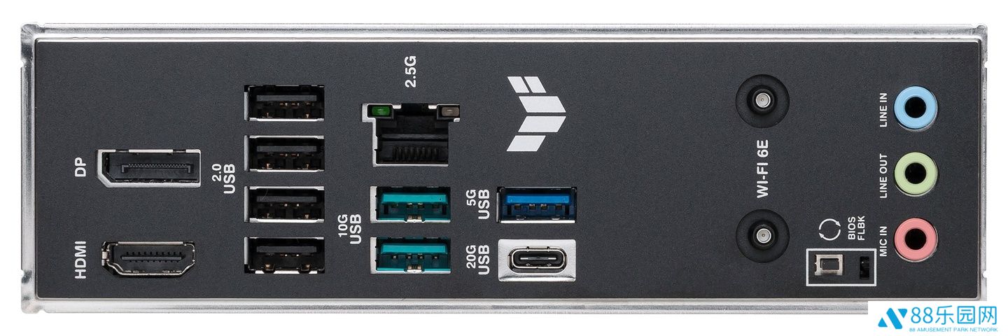 后置接口:1× HDMI 2.1 TMDS、1× DP 1.4、4× USB-A 480Mbps、2× USB-A 10Gbps、1× 2.5GbE RJ45、1× USB-C 10Gbps、1× USB-A 5Gbps、一对 Wi-Fi 天线插孔、3× 音频插孔。