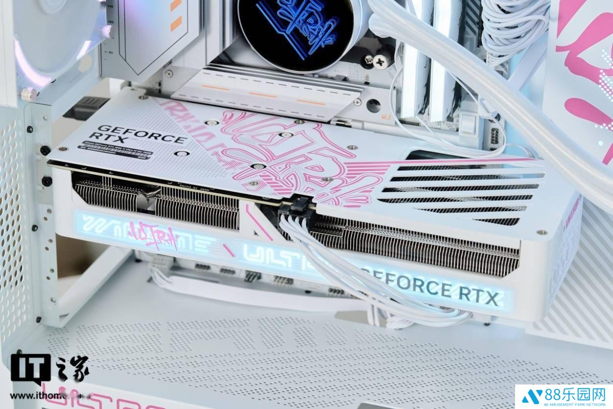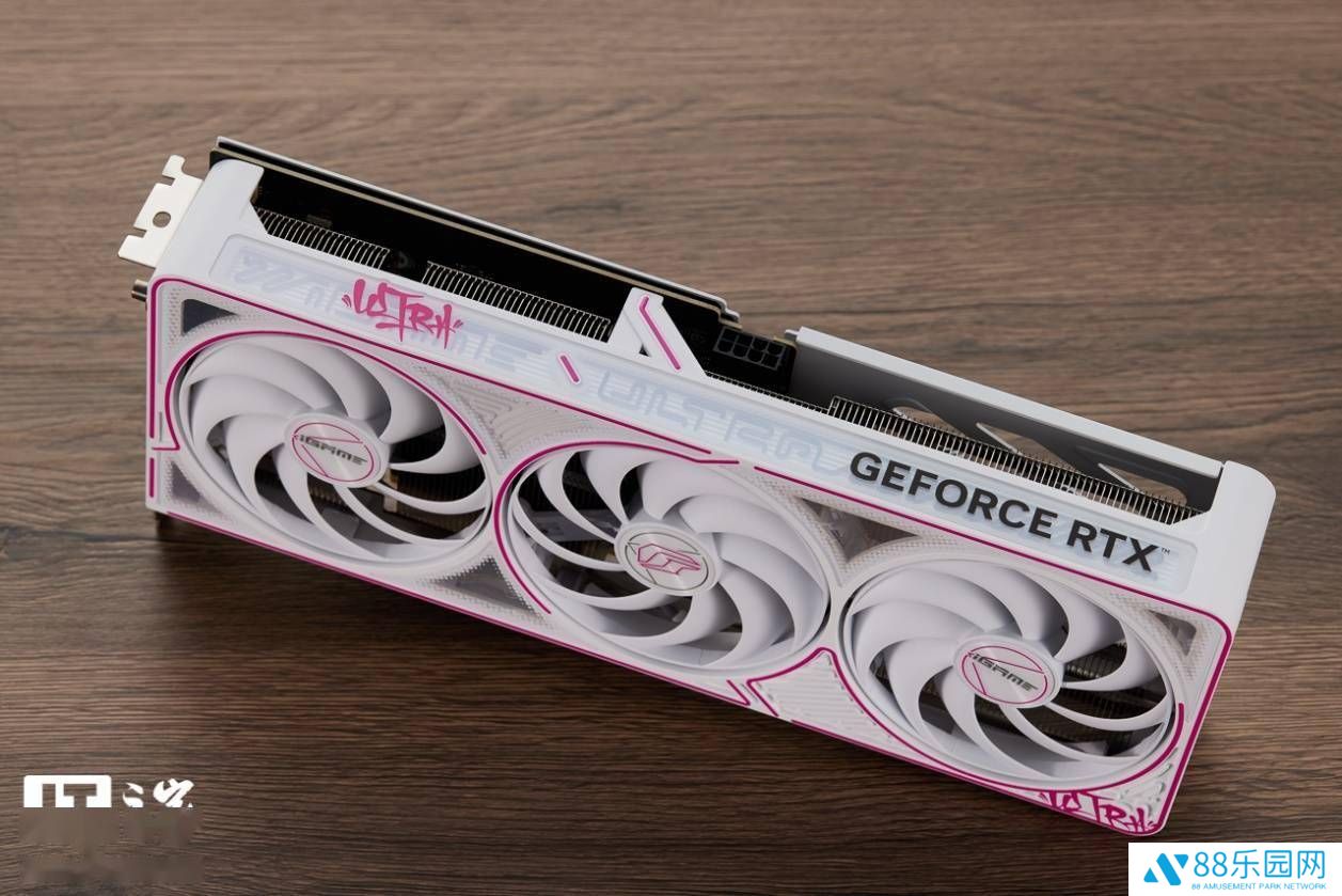 仔细观察显卡卡身,可以发现多处精致的设计细节。所有图案和文字都经过艺术化处理,桃粉色线条勾勒出显卡的轮廓,配色既活泼大胆又不失和谐,避免了过于花哨的感觉。显卡背板上醒目的 Ultra 涂鸦喷墨风格艺术字,以及卡身尾部的浮雕风格 Ultra 艺术字图案,进一步提升了显卡的整体视觉效果。