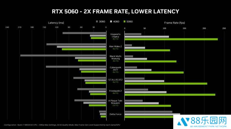 RTX 5060不仅继承了RTX 50系列其他GPU的硬件创新,还融入了最新的Shader Core、Tensor Core、Ray Tracing Core以及超快的GDDR7显存技术。这些技术的结合,使得RTX 5060在支持DLSS 4多帧生成技术的游戏中,性能表现是上一代RTX 4060的两倍。这意味着玩家将能够享受到更加流畅、逼真的游戏画面,获得前所未有的游戏体验。