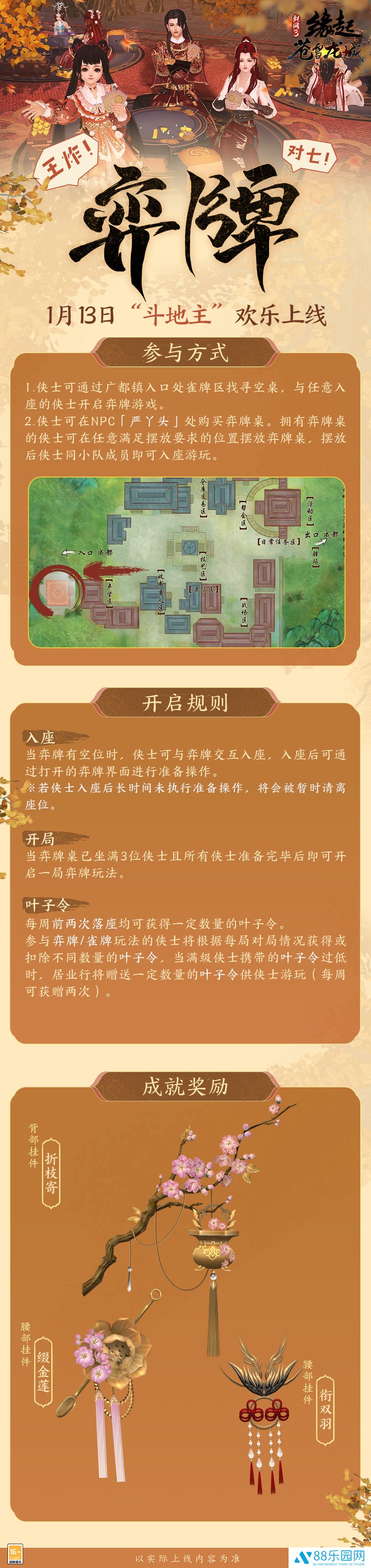 不会打麻将怎么办?《剑网3缘起》全新「弈牌」玩法趣味来袭!该玩法取自经典扑克牌游戏“斗地主”,牌型较少,玩法简单,极易上手!成都摆放了数张奕牌桌供侠士欢乐游玩,前往「严丫头」处购买弈牌桌,还可随时随地与同小队成员入座游玩!此次我们也准备了与「弈牌」相对应的全新成就与成就奖励挂件,祝各位侠士新的一年连对连连福相连,对子成对喜成双!
