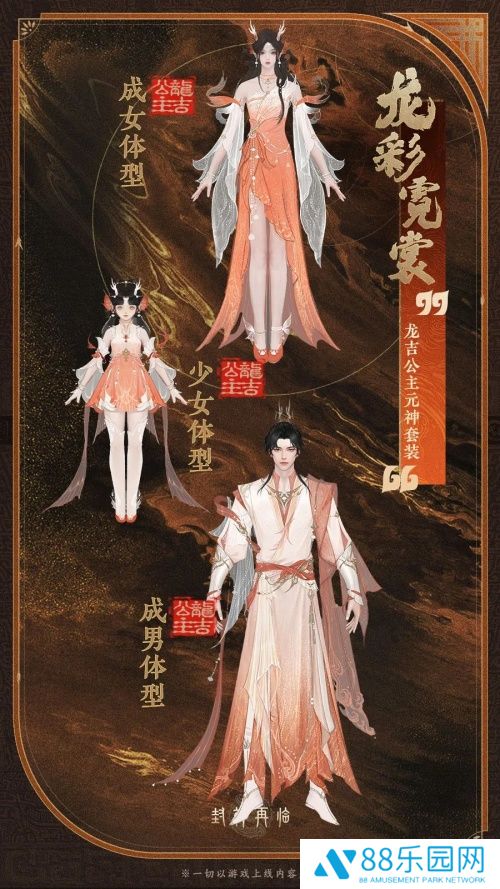 龙吉公主元神套装同步公布。道友与龙吉公主共鸣,并完成指定任务,即可免费获取下方对应体型的套装哦!