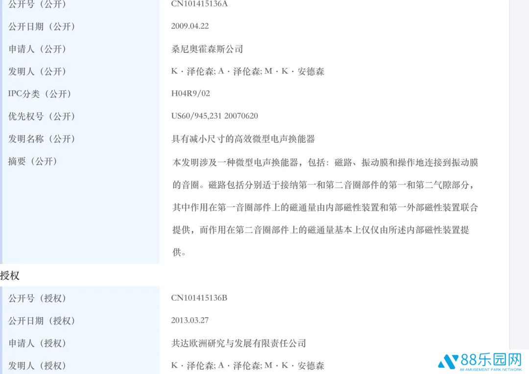 本站注意到,根据国家知识产权局信息,“具有减小尺寸的微型电声换能器”的发明专利最初由桑尼奥霍森斯公司申请,发明人为 K・泽伦森、 A・泽伦森、M・K・安德森,首次公开于 2009 年 4 月;2013 年 3 月,该发明专利权在经过了专利申请权、专利权的转移等操作后,发明专利权授予了共达欧洲研究与发展有限责任公司。
