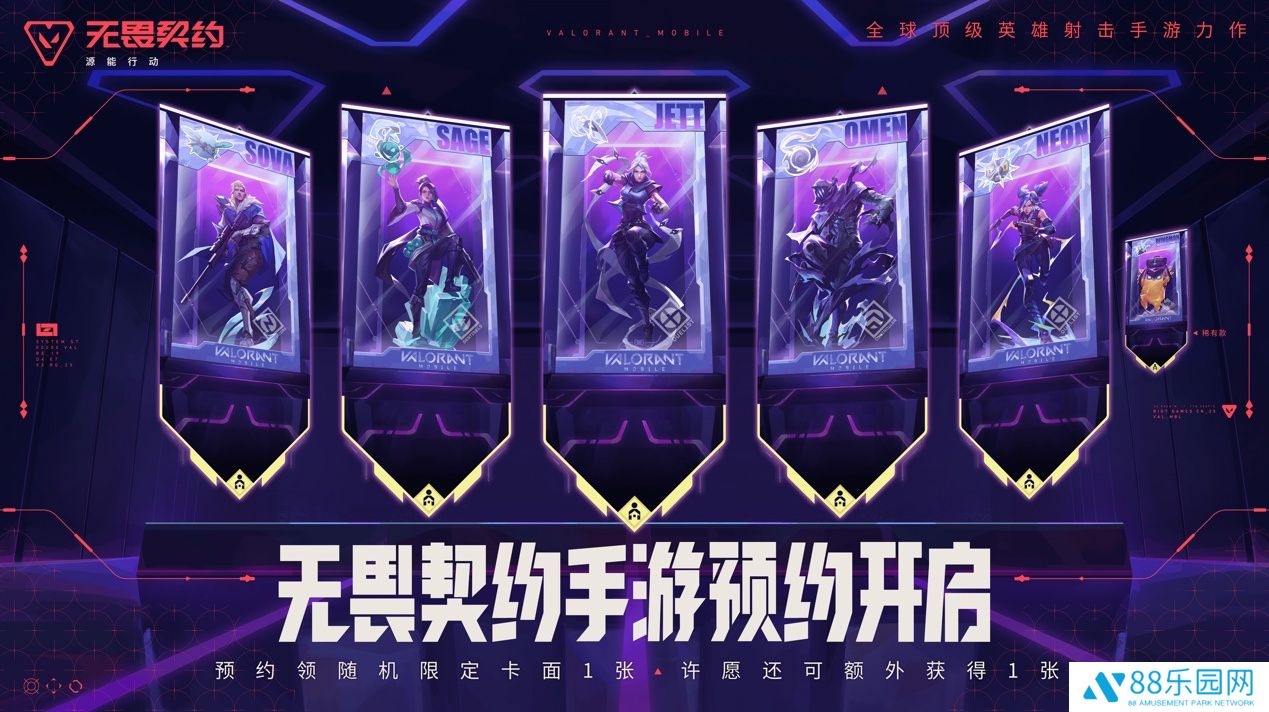 《无畏契约手游》全渠道预约于今日开启,据本站了解,活动期间完成预约登记,可得动态喷漆,同时可获得一次抽取盲盒卡面的机会,盲盒包含定制角色卡面和稀有款皮蛋卡面。通过分享活动向其他玩家许愿,可额外请求好友复制卡面给自己。