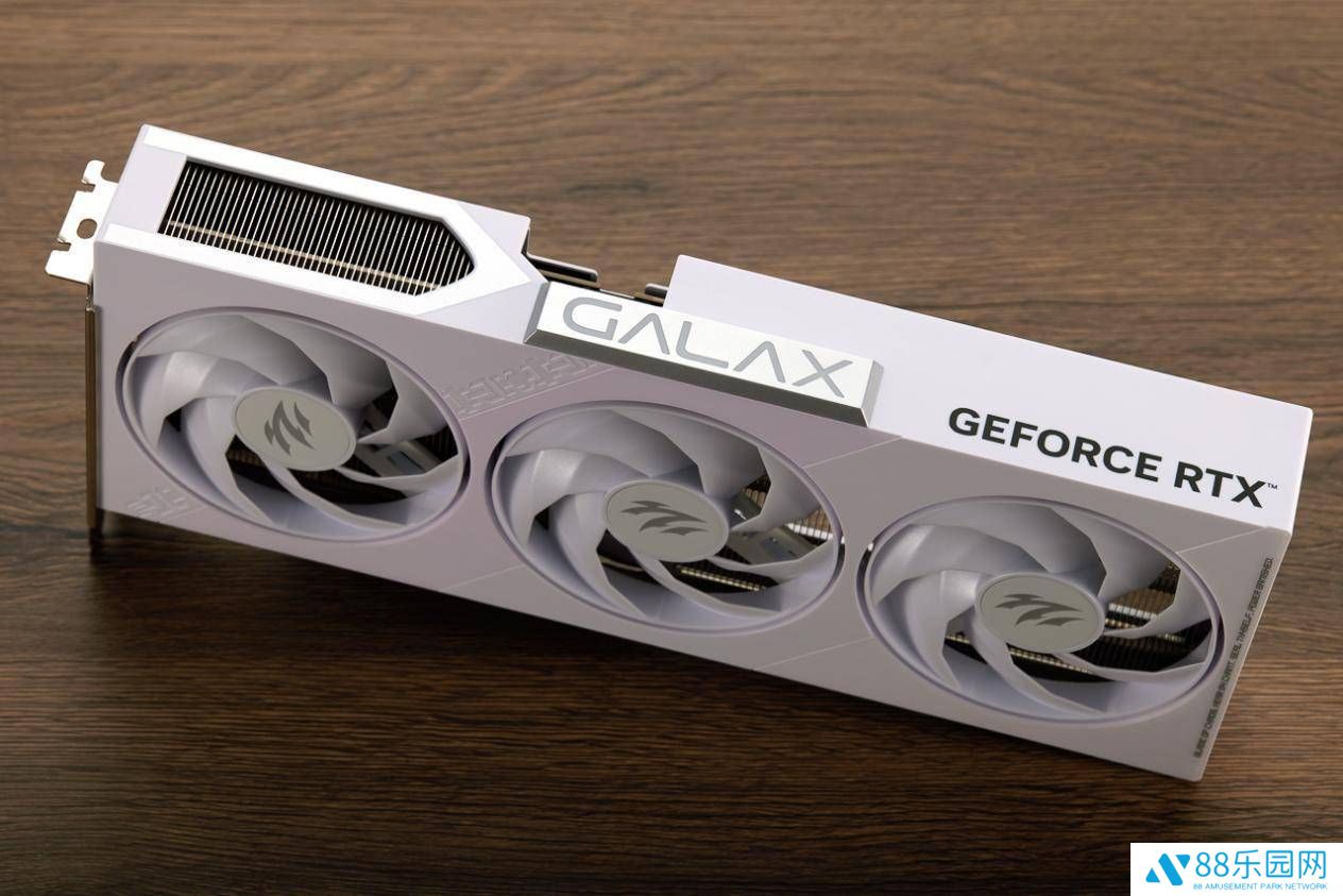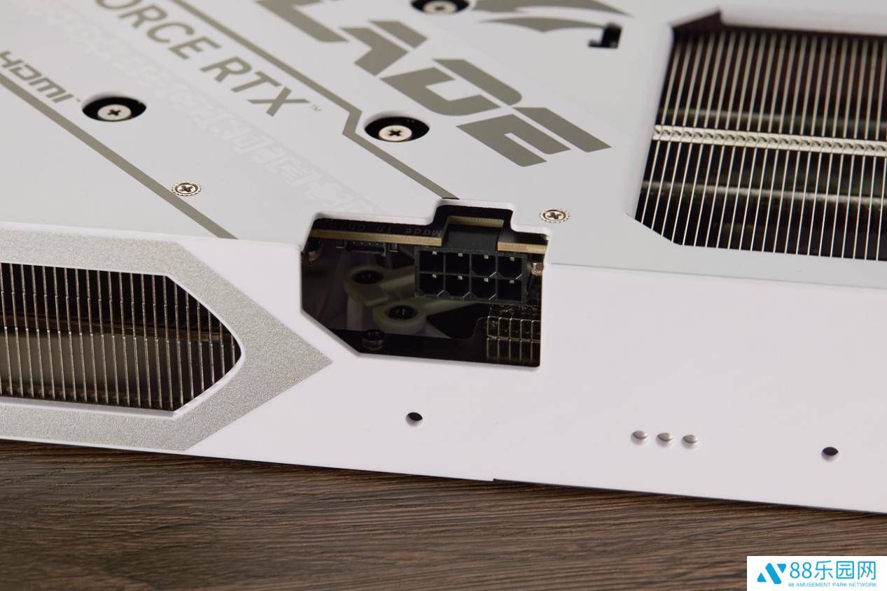 显卡的背面配备了一块加固的铝合金背板,采用白色涂装,左侧点缀有黑色斜切装饰和BLADE Logo,右侧则是一条完整的散热开口,透过开口可以看到内部整齐排列的散热格栅,既美观又实用。