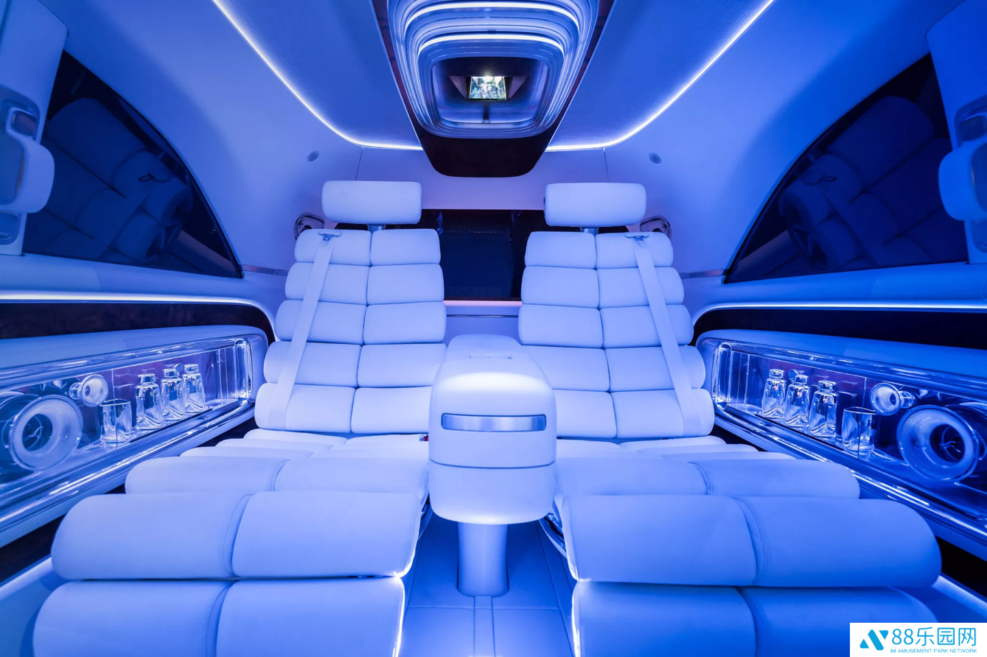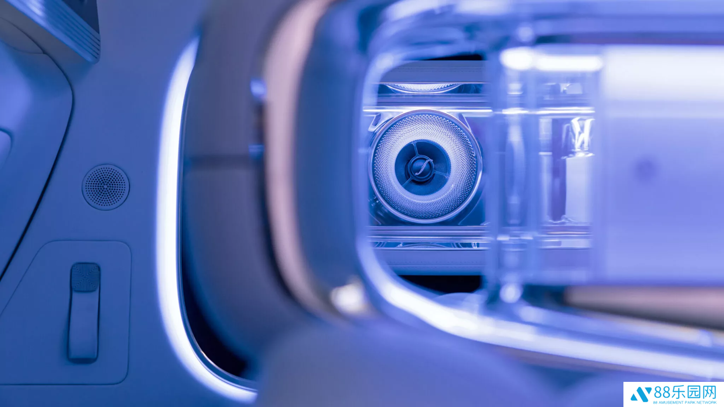 乘客上车时,一块 65 英寸 4K 巨幕从地板升起,搭配 42 个扬声器和七个投影仪,甚至能将车窗化为额外投影面,打造 360 度沉浸式观影体验。