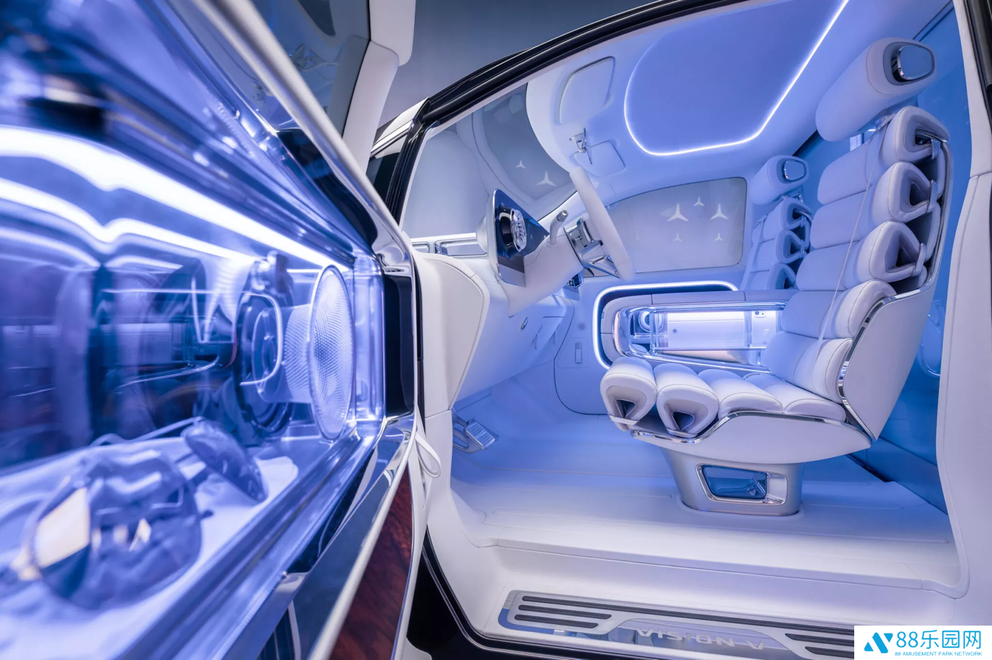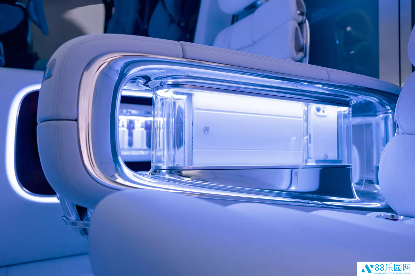 乘客靠近时,格栅会上演灯光秀,并点亮引擎盖上的梅赛德斯星标。后方则由超过 450 个三维发光百叶窗组成的 LED 光带环绕,既是尾灯也是刹车灯,极具辨识度。